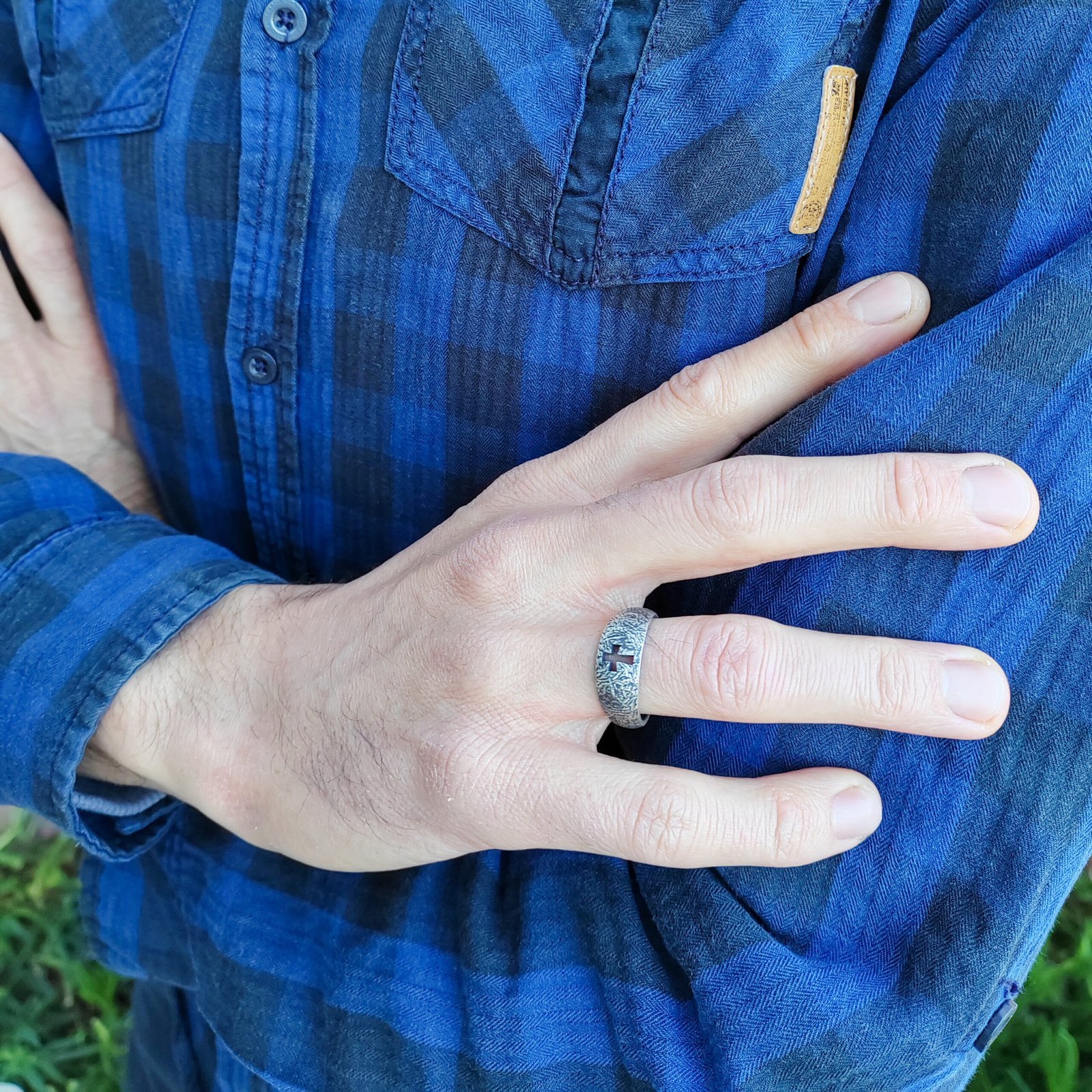 Χειροποίητο ασημένιο οξειδωμένο δαχτυλίδι με σταυρό, μια επιλογή για τον άνδρα από την συλλογή μας.